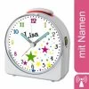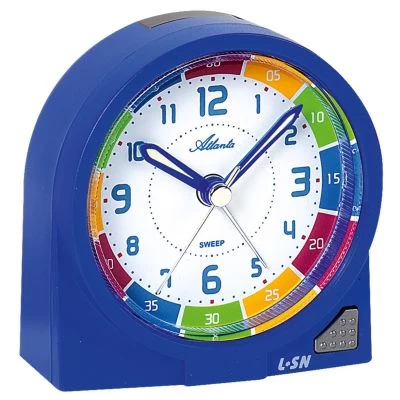 Quarzwecker mit weißem Zifferblatt, gut ablesbare blaue Zeiger und Zahlen, bunte Minutenmarkierungen, geräuscharm durch schleichenden Sekundenzeiger, Weckwiederholung (Snooze), Zifferblattbeleuchtung, einfache Einstellung, Kunststoff-Gehäuse in Blau, Größe (B x H x T) 7,5 x 8 x 3,5 cm, benötigt 1 Batterie AA (nicht im Lieferumfang enthalten)