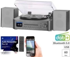 Dank des Auvisio MHX-630.dab hören Sie jetzt Ihre Lieblings-Musik von Schallplatte, CD, Digitalradio, USB-Stick, Ihrem Smartphone oder anderen Bluetooth Geräten! Das integrierte Internetradio bietet eine Auswahl an über 30.000 Internet-Stationen und Podcasts aus aller Welt. Der DAB+-Empfang ermöglicht Ihnen eine hervorragende Klangqualität Ihrer Lieblings-Radiosender und falls es Ihren Lieblingssender nicht digital gibt, wechselt man einfach zum klassischen UKW-Empfang. Per Bluetooth kann Ihre Musik mit oder ohne Kabel gestreamt werden, wie z.B. von Smartphone und Tablet-PC. Andere Audiogeräte ohne Bluetooth können einfach per Klinken-Kabel mit dem Gerät verbunden werden. Über die Konvertierfunktion können Ihre Musik-Schätze gerettet werden. Die Aufnahmen können von Schallplatten, CDs und externen Audioquellen direkt auf den USB-Stick übertragen werden. Die mitgelieferte Musik-Software Audio Restaurator Pro 10 ermöglicht ein Bearbeiten Ihrer Aufnahmen. Diese kann beispielsweise ungewolltes Rauschen oder Knackser in der Audiodatei entfernen. Ebenfalls können Ihre MP3-Aufnahmen mit ID3-Tags u.v.m. versehen werden.