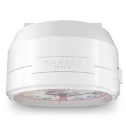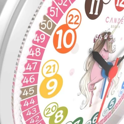 Verschönern Sie das Kinderzimmer mit diesem farbenfrohen Einhorn-Wecker! Die harmonisch abgestimmten Farben, zusammen mit dem liebevoll gestalteten Zifferblatt, machen ihn zu einem absoluten Blickfang im Kinderzimmer. Die Tischuhr mit Weckfunktion ist von einem weißen Kunststoffrahmen mit hochglänzender Oberfläche umgeben und hat einen Durchmesser von 10,8 cm bei einer Tiefe von 7,5 cm. Das integrierte Uhrwerk mit schleichender Sekunde verursacht keine Tickgeräusche und arbeitet nahezu geräuschlos. Der standsichere Mädchenwecker ist kindgerecht gestaltet, ohne scharfe Kanten und ist mit nur einem Einstellknopf ganz einfach zu bedienen. Praktisch sind auch die Licht- und die Snoozefunktion. Durch die integrierte Snooze-Funktion kann der Weckton für ungefähr 5 Minuten pausiert werden. Bei Dunkelheit kann dieser Lernwecker mit der Taste oben am Gehäuse für 5 Sekunden beleuchtet werden, wodurch die Uhrzeit problemlos abgelesen werden kann. Das LED Licht und das Uhrwerk werden insgesamt mit drei 1,5 Volt AA Batterien betrieben, die nicht im Lieferumfang des Produktes vorzufinden sind. Das süße Einhorn begeistert alle Kinderherzen und animiert Ihr Kind dazu, die Uhrzeit lesen zu lernen.