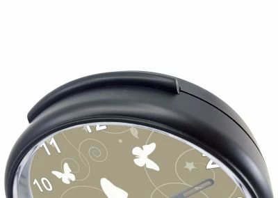 Der Wecker hat keinen Sekundenzeiger und dadurch ist kein Ticken zu hören.
