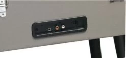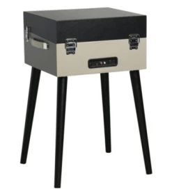 • Freistehender Plattenspieler, eingebauter Verstärker; Retro-Look mit Kofferdesign und schwarzen Beinen