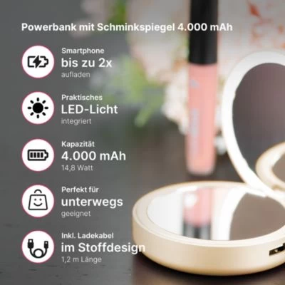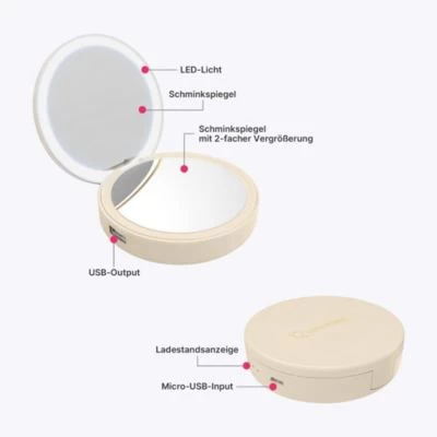Schminkspiegel und mobile Stromversorgung für unterwegs. Frisches Make-up und eine Portion Extra-Power gefällig? In diesem Kosmetikspiegel verstecken sich nicht nur Normalspiegel und 2-fach-Vergrößerungsspiegel, sondern auch ein Zusatzakku als Ladestation für unterwegs. Ein absolutes Muss in jeder Tasche! Die Lotta Power Powerbank nimmt keinen unnötigen Platz in der Handtasche weg. Im Gegenteil: sie spart sogar Platz, weil sie nämlich mehrere Funktionen gleichzeitig erfüllt! Diese einzigartige Kombination wird Sie niemals im Stich lassen. Das eingebaute LED-Ringlicht sorgt für genügend Licht beim Schminken und der 4.000 mAh-Lithium-Akku für eine ausreichende Ladung Ihres Smartphones oder Tablets.