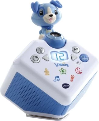 Die niedliche „V-Story Hörspielbox“ von VTECH wird Ihr Kind verzaubern. Dank der zahlreichen integrierten Geschichten, Märchen, Gutenachtgeschichten und Liedern sorgt sie für viele spannende und schöne Stunden. Dank der LED-Icons ist eine Auswahl zwischen den verschiedenen Genres ganz einfach. Der bewegliche Lichtprojektor wirft die jeweils zur Story passenden Motive an die Decke oder an eine Wand. Mithilfe der Aufnahmefunktion können sogar Geschichten aufgenommen und auf Knopfdruck wieder abgespielt werden. Über den VTECH Download-Manager können zusätzlich kostenlos viele weitere Geschichten heruntergeladen werden.